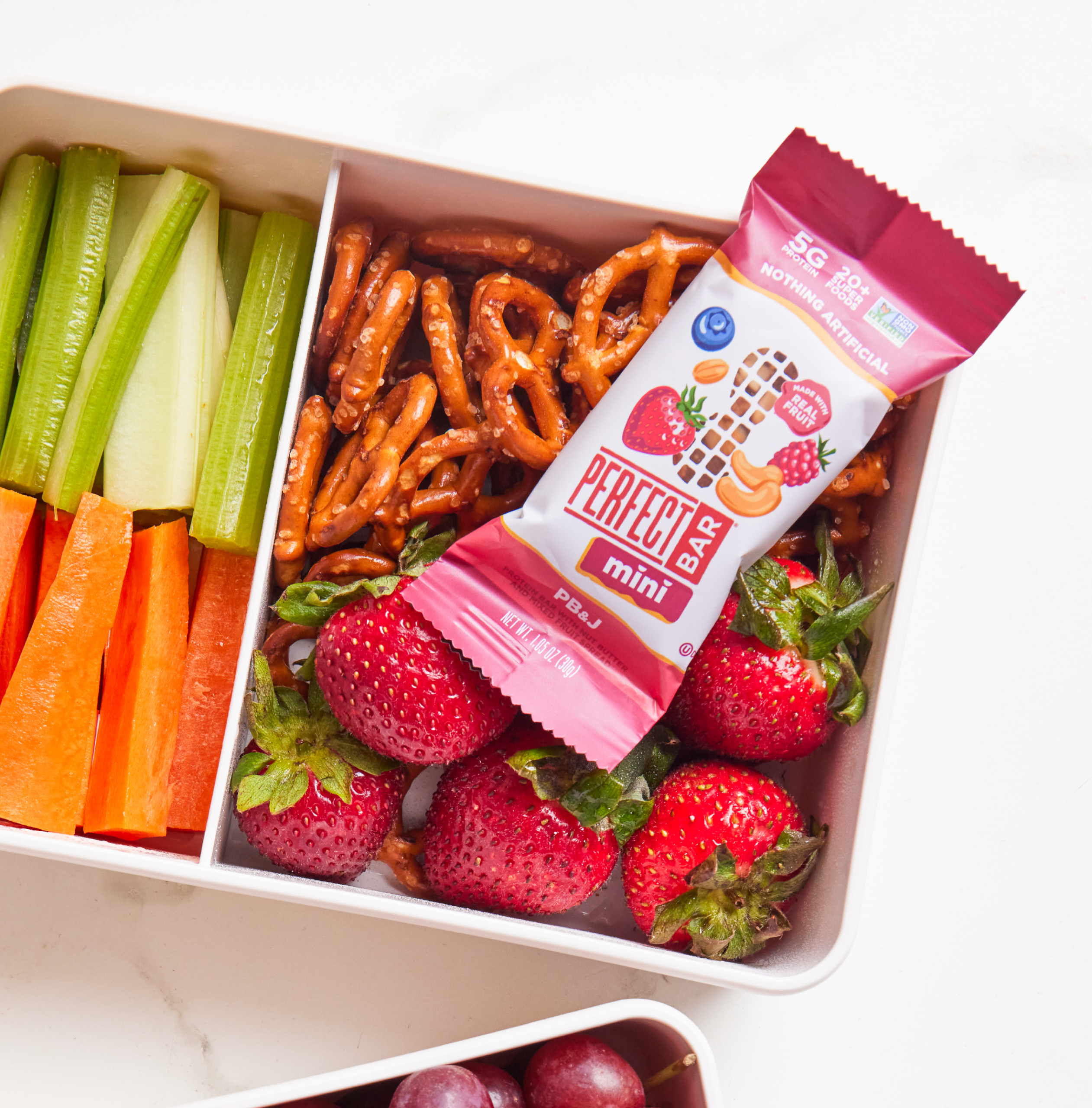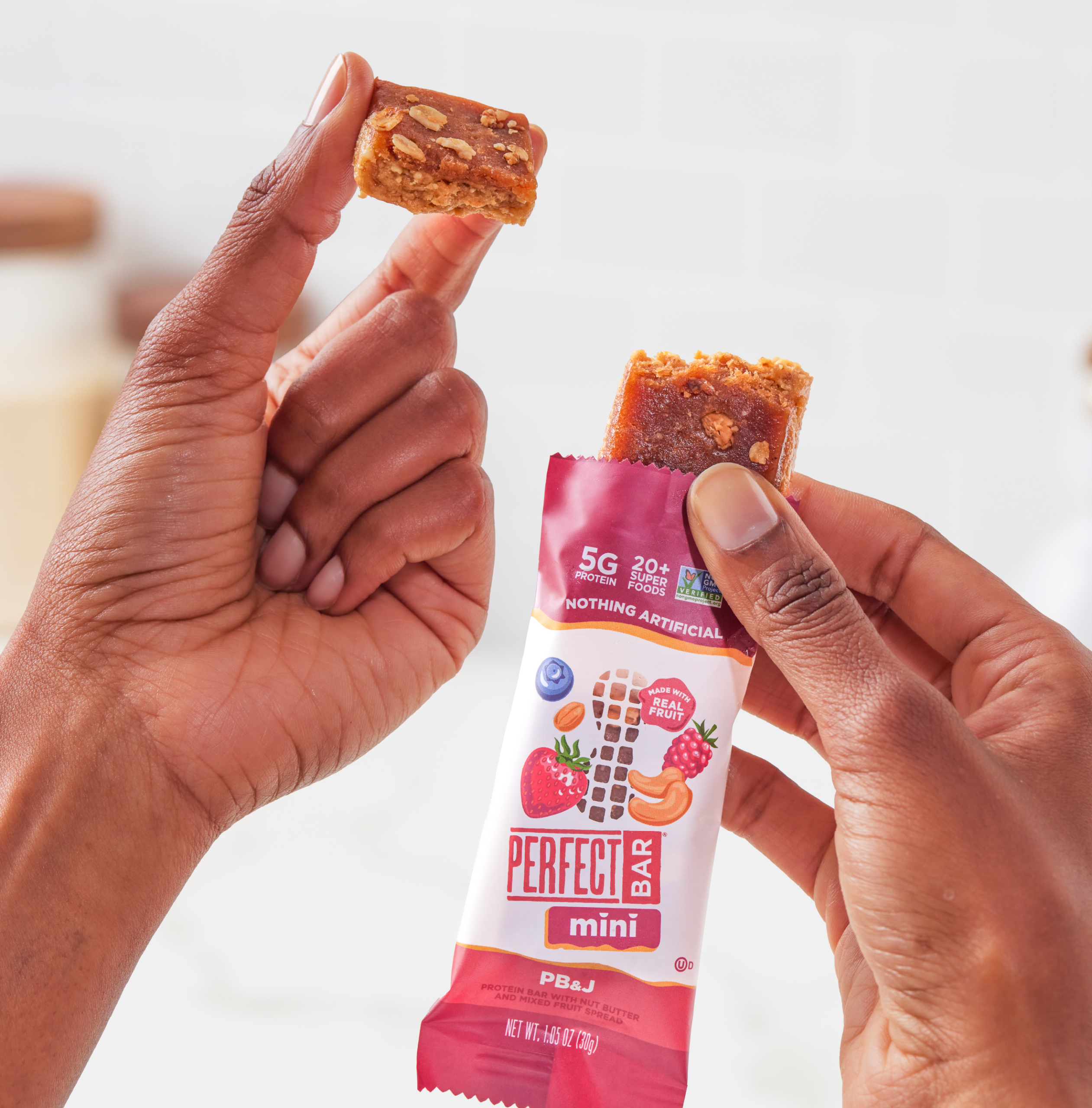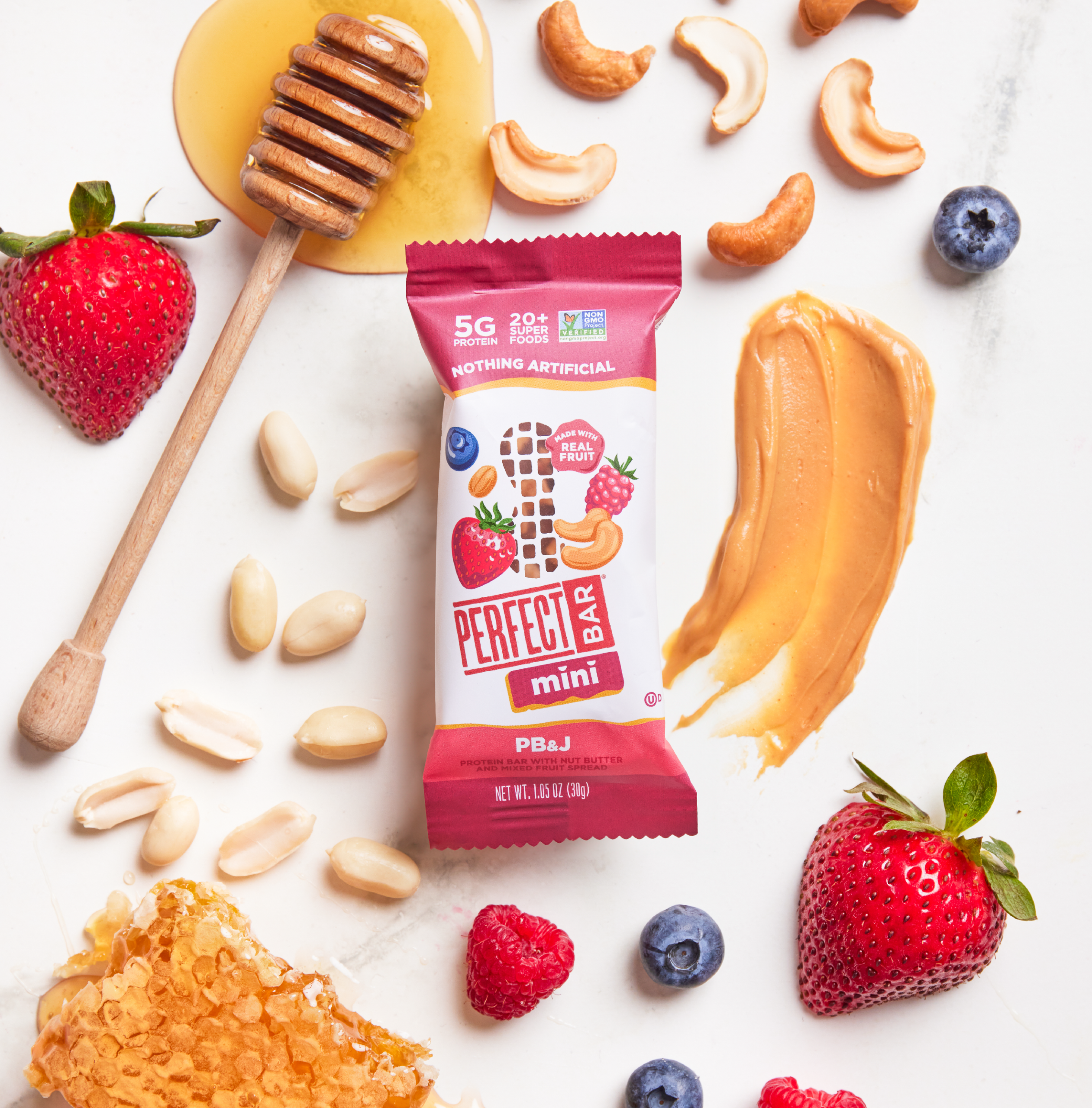 Experience the classic taste of peanut butter and jelly reimagined in a convenient, on-the-go Mini. Perfect Bar PB&J Mini is crafted with freshly ground nut butter, real fruit, crispy quinoa and toasted oats. Fridge fresh with 20+ superfoods, 5 grams of protein, and nothing artificial, it’s snack time, perfected.Â